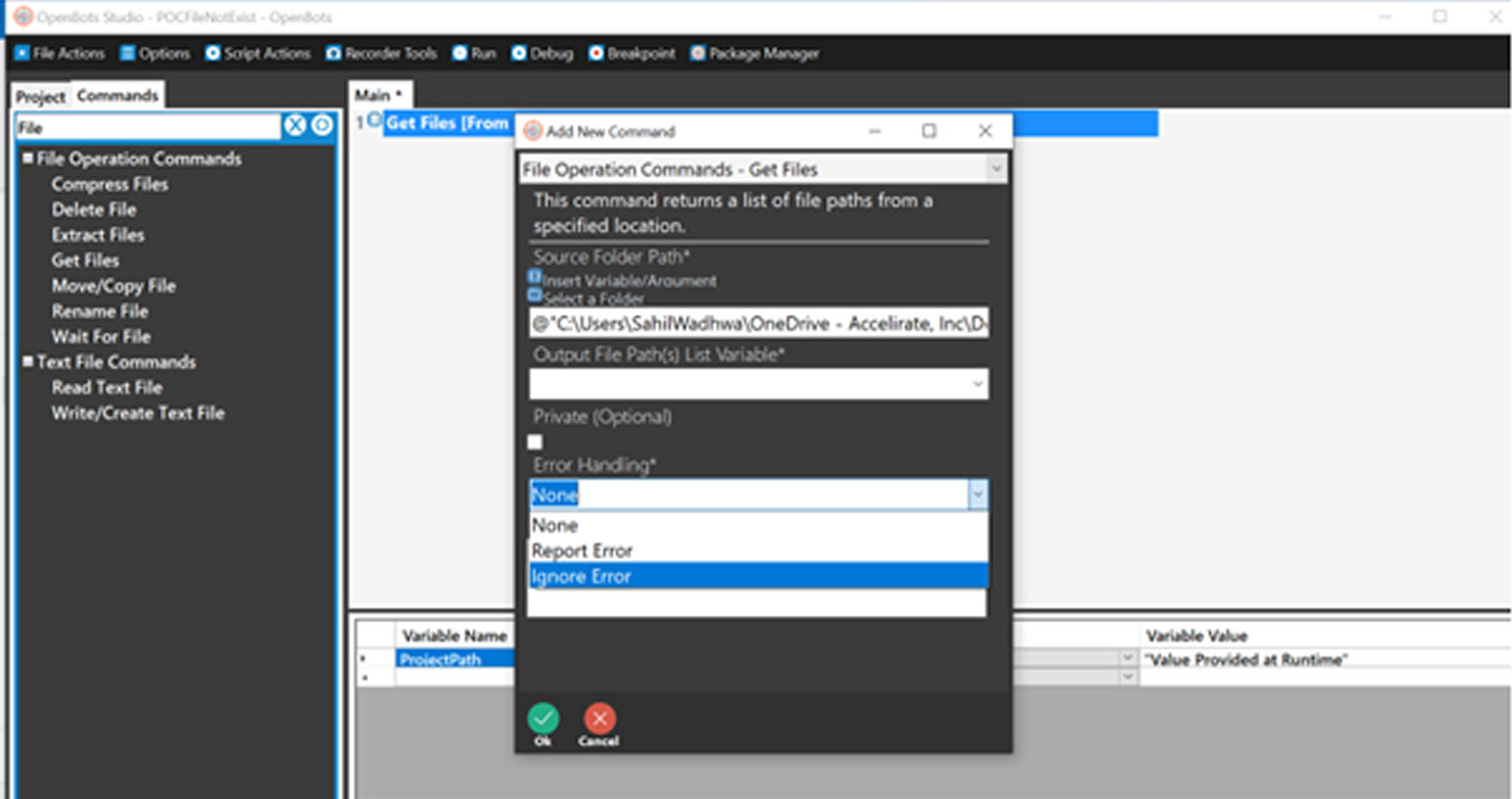 Almost every command in OpenBots v1.5 and newer contains an error handling property. This property allows developers to choose one of the three options “None”, “Report Error”, and “Ignore Error” as the outcome, if an error is received with that particular command while executing a workflow.