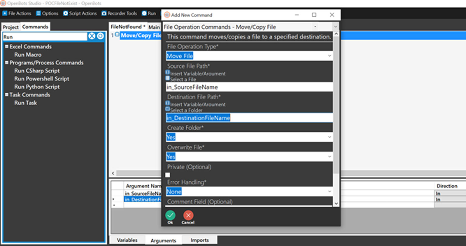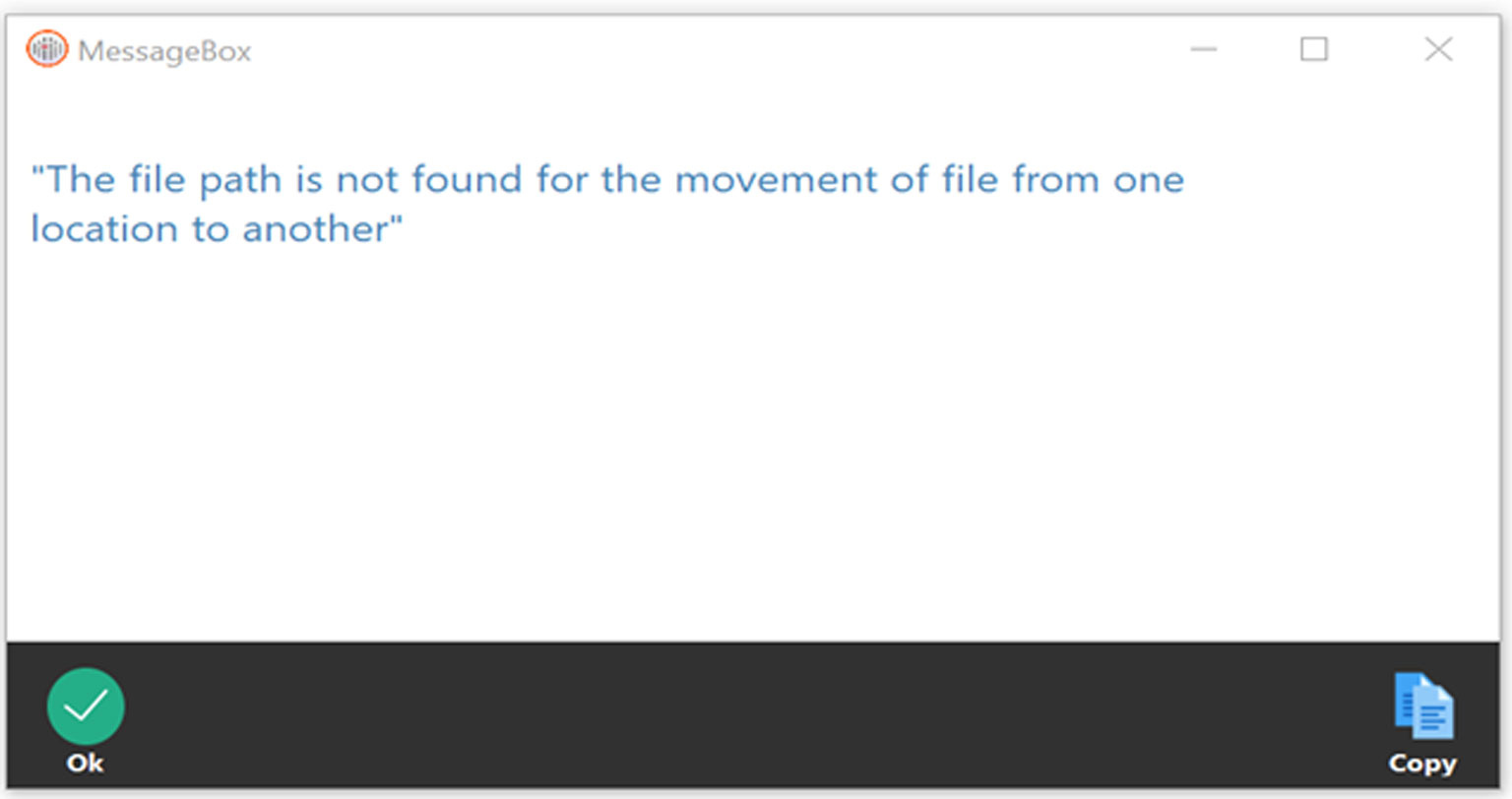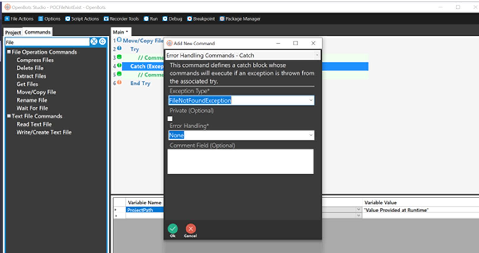Every command that is expected to generate an exception is surrounded by a “try catch” block. As shown in the images below, the developer is trying to move a file from a source path to a destination path, however the file does not exist in the source folder. The move command in Openbots Studio would generate an exception of the “FileNotFound” type, where the developer inserted a try catch block to handle the exception. Developers can handle various types of exceptions through a catch block such as Argument Exception, DivideByZero Exception, IndexOutofRange Exception, and KeyNotFound Exception to name a few.
